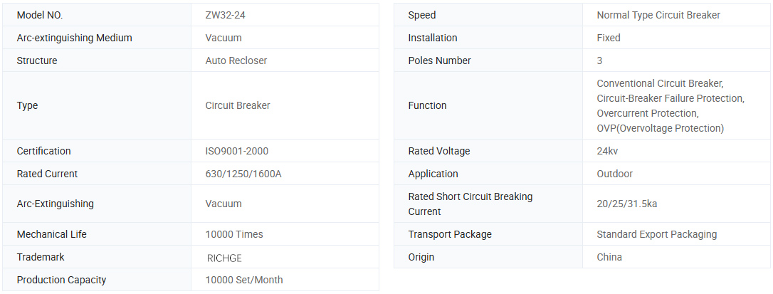 ZW32-24 Series Outdoor Tegangan High Vacuum Breaker digunakan dalam AC 50Hz, voltase teringkat 24KV sistem daya tiga fase untuk penutup/pemecahan arus beban, arus berlebih dan hubung singkat. Pemutus dapat melengkapi dengan pengontrol pelecehan ke Identity Break Current Characteristik dan mencapai beberapa isolasi penahan otomatis atau kesalahan. PT yang disediakan sendiri sebagai sumber daya, ia menjadi pemutus sirkuit pintar yang mampu mengontrol dengan output tegangan dan arus.