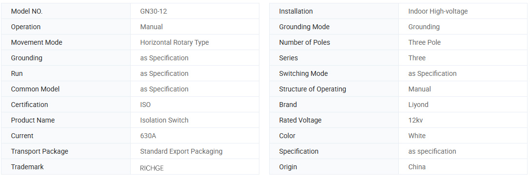 GN30-12 Jenis Sakelar isolasi tegangan tinggi dalam ruangan adalah tipe baru dari sakelar isolasi dengan pisau kontak rotary. Struktur utama adalah bahwa bidang atas dan bawah dari sasis umum tiga fase difiksasi dengan dua set isolator dan kontak, dan sakelar dibuka dan ditutup dengan memutar pisau kontak.