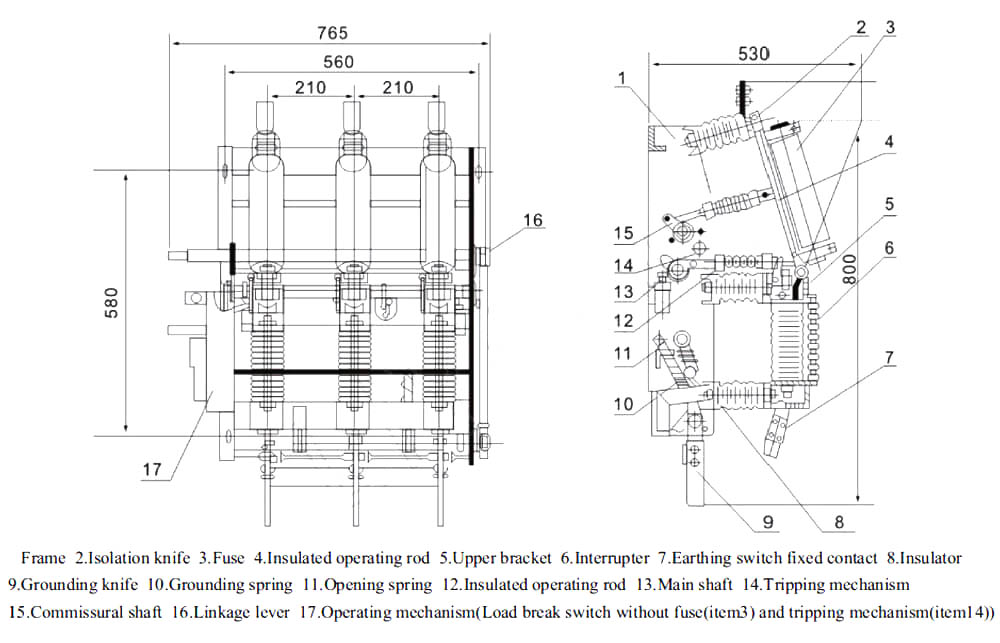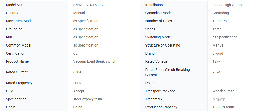 FZN21-12 seri sakelar beban voltage bertegangan tinggi terutama terdiri dari framer, sakelar pemutusan (sekering pembatas saat ini dari kombiner ada di sakelar pemutusan), tabung sakelar vakum, sakelar pentanahan, mekanisme operasi pegas dan sebagainya. Produk ini memiliki struktur yang ringkas, volume kecil, umur panjang, kapasitas penutupan dan pemecahan yang kuat, dan pengoperasian dan pemeliharaan yang mudah. Sakelar vakum dilengkapi dengan mekanisme yang dioperasikan pegas, yang mengadopsi penyimpanan energi pegas motor listrik (manual lain), dan ada dua jenis metode penutupan: penutupan elektromagnet dan pemisahan dan penutupan manual. Sakelar pemutusan, sakelar vakum dan sakelar pembumian saling terkait satu sama lain (interlocking mekanis) untuk mencegah kesalahan operasi.