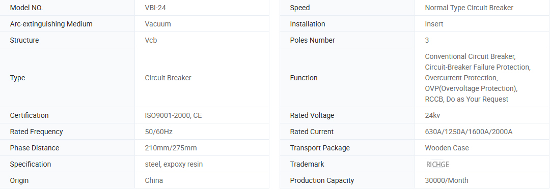 Seri VBI-124 dari pemutus sirkuit vakum tegangan tinggi dalam ruangan dengan tiang tertanam adalah tiga frasa A.C.50 Hz peralatan distribusi daya dalam ruangan dengan tegangan pengenal 24 kV. Ini digunakan untuk melindungi dan mengendalikan peralatan listrik di bidang industri dan perusahaan penambangan, pembangkit listrik dan gubringan.
